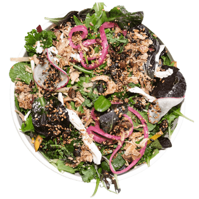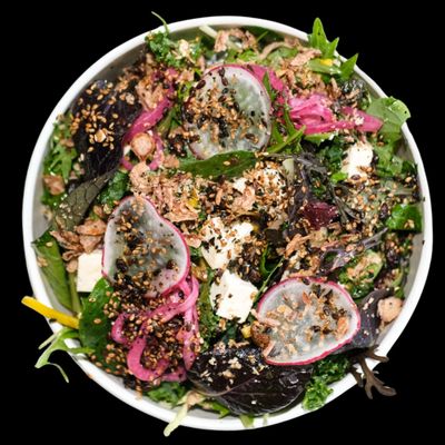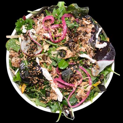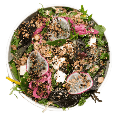 Spring Onion, Kale, Pickles, Shallots, Red Cabbage, Furikake, Sesame & Miso Dressing. (ng,df)