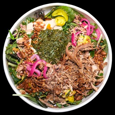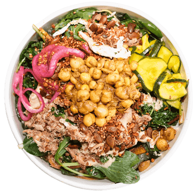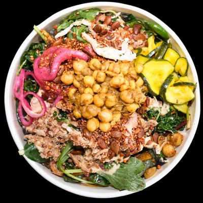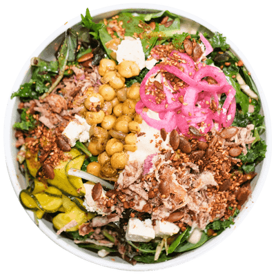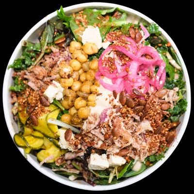 Braised Chickpeas, Kale, Pickles, Shallots, Red Cabbage, Crispy Dukkah, Hummus, Sumac Vinaigrette. (vg,ng)